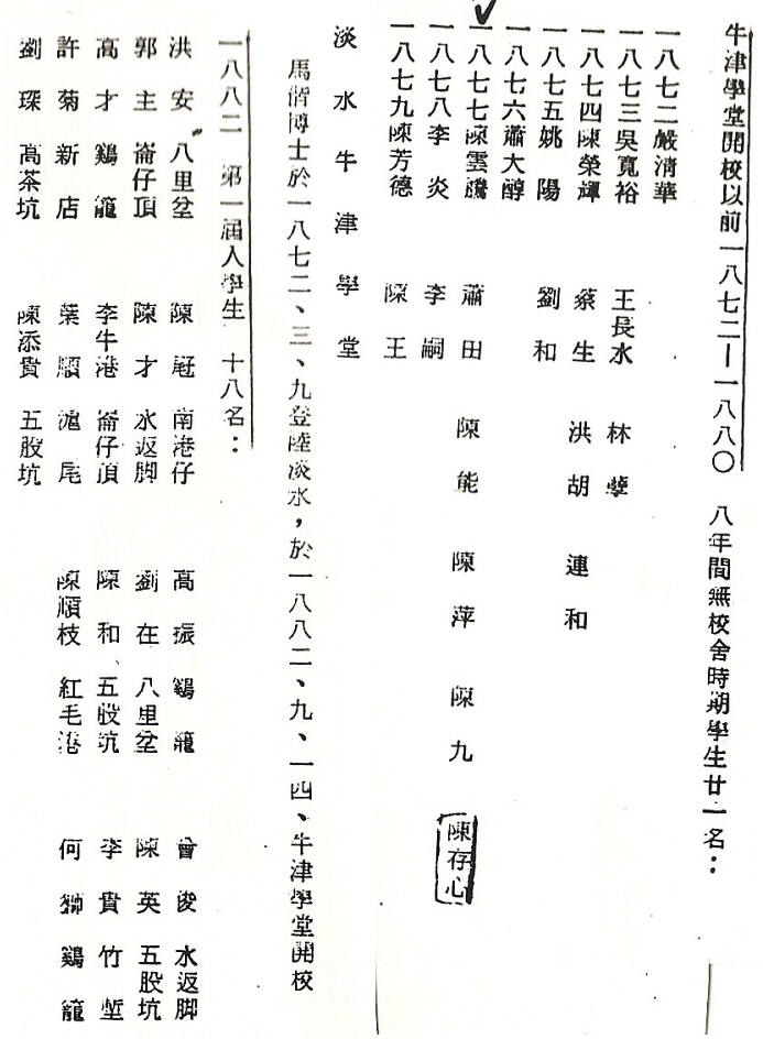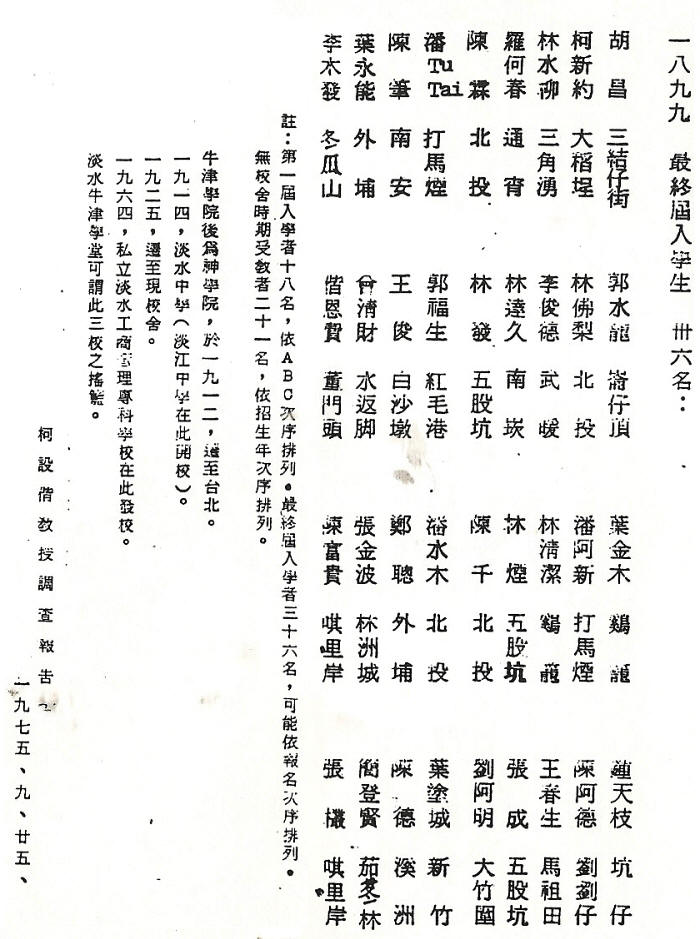 柯設偕製 錄馬偕的學生的名 : 牛津學堂開學以前(1872-1880)21名、淡水牛津學堂第1屆入學生(1882)18名、最終屆入學生 (1899)36名。這是1975年9月25日柯設偕的調查報告。