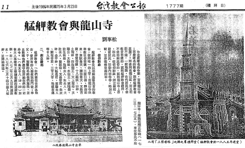 他開頭便說:「台北最著名的寺廟,首推龍山寺;而最著名的教會,則非艋舺教會莫屬了。兩者同在龍山區,而且相距不遠,……」豈止在台灣當地出名,艋舺教會當年也隨著馬偕牧師的事蹟,聲名遠播到了太平洋彼岸的北美洲。