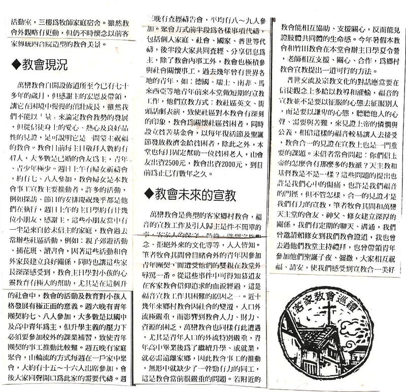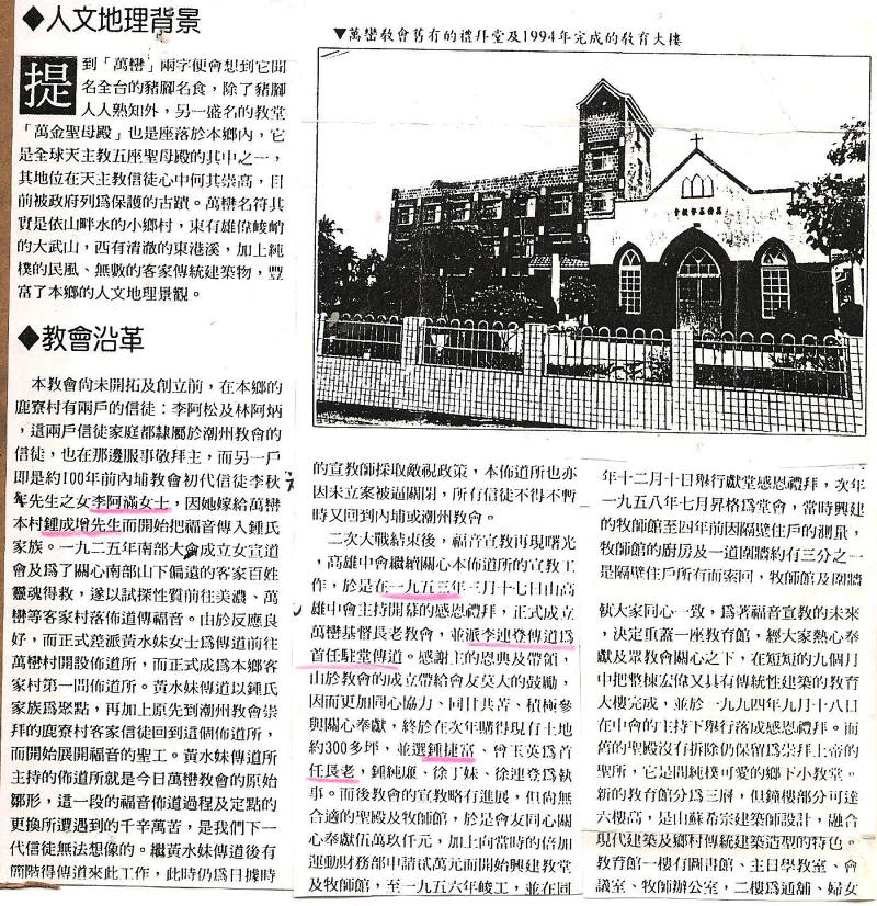 林暢有撰 「在困境中成長的萬巒教會」《台灣教會公報》 2329 期 1996年10月20日 p.10 客家教會巡禮 7 萬巒鄉位於屏東縣轄的中部,東仰大武山麓,與泰武、來義兩鄉為鄰,西有東港溪,以竹田鄉為界...萬巒長老教會於1953年3月17日正式開幕,但有其前史。1958年7月誠為堂會。