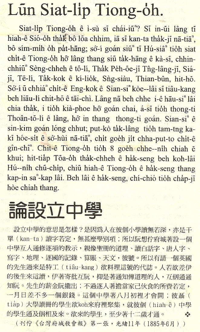 《台灣府城教會報》第1張 光緒11年 (1885年6月) 白話字:林晚生漢譯 見於《台灣教會公報》 2424期 1998年8月16日 p. 18。