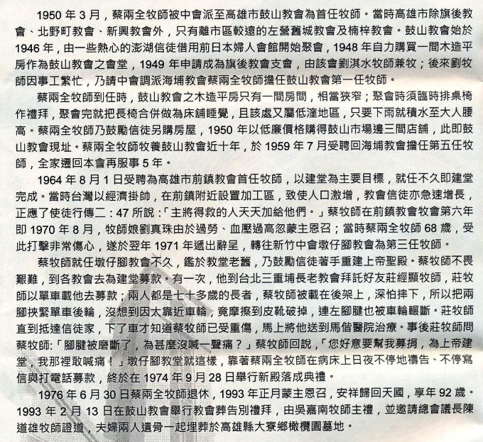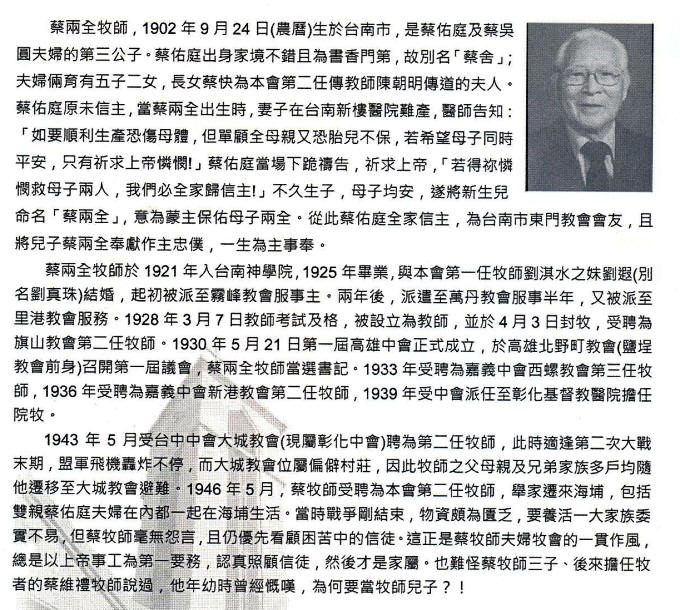 「第二及五任蔡兩全牧師」《台灣基督長老教會海埔教會週報》2010年11月14日及21日。