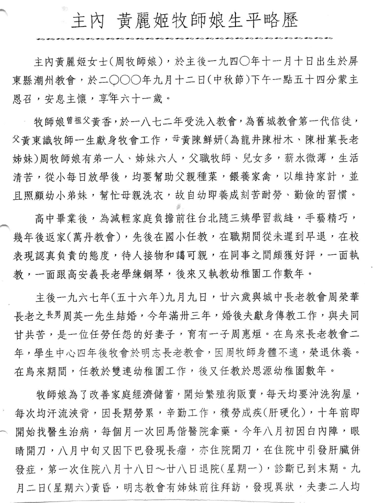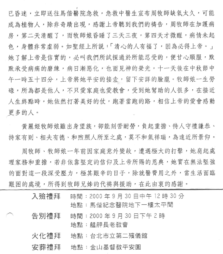 治喪委員會撰。黃麗姬(1940 - 2000)是黃東識牧師和陳鮮妍之次女,適周英一牧師。