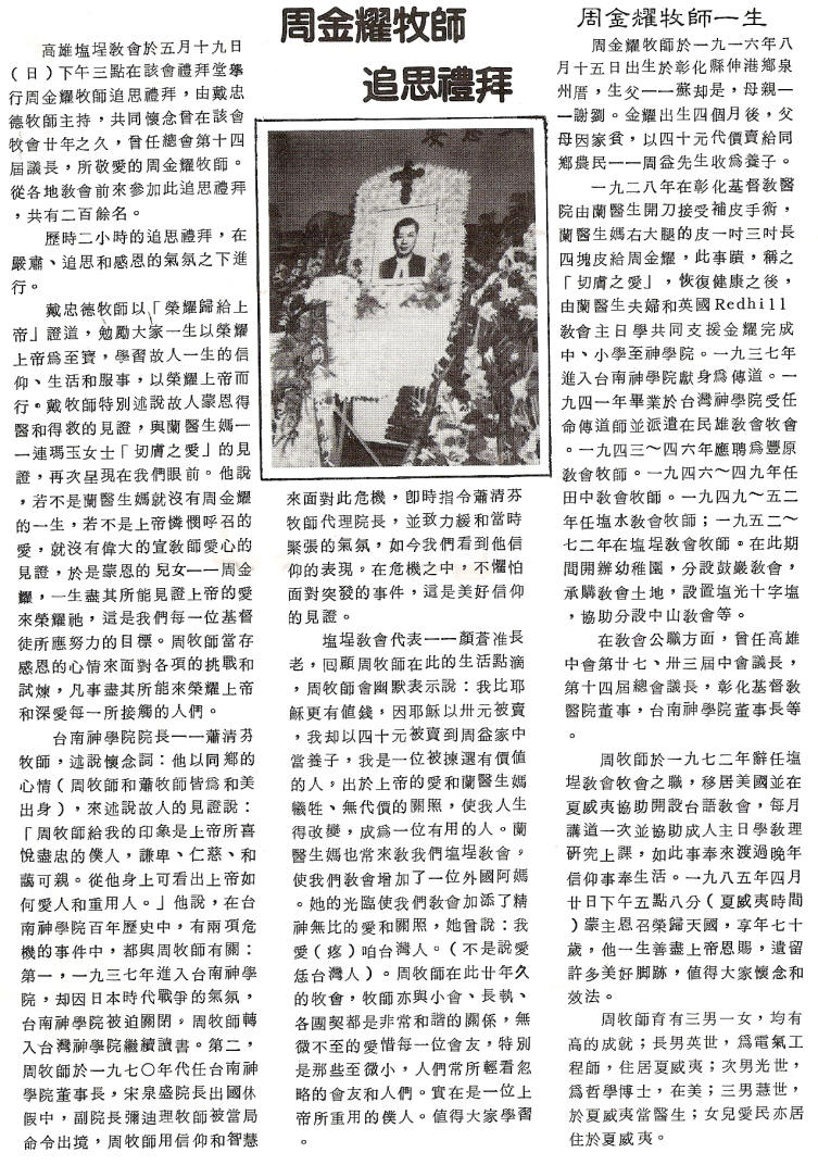 錄自《蘭醫生媽紀念專輯》1985年8月 p.140 按:周金耀牧師,1916年8月15日生,1985年4月20日去世,享年70歲。高雄鹽埕教會於1985年5月19日舉行追思禮拜。附「周金耀牧師一生」。周金耀牧師於1952-1972年間牧鹽埕教會。