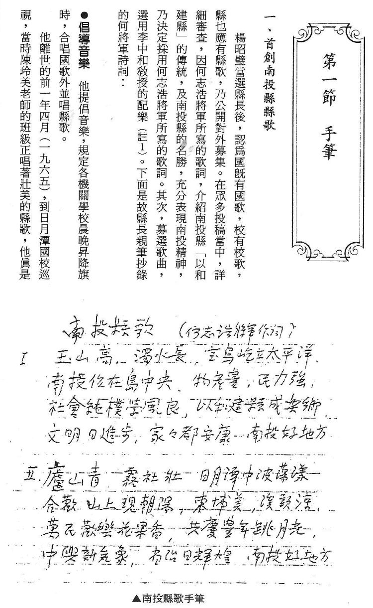 《楊昭璧愛的足跡》楊貞惠撰 曹永洋校訂, 臺中市 楊貞惠 1998年10月 p.172-173,即該書第5部論述第1章第1節手筆,一、首創南投縣縣歌, 二、論派別。[文出處:註1、江慶泉先生提供, 2、《南投青年》30期 陳玲美老師,3、《徵信新聞��黃耕勤 ]。