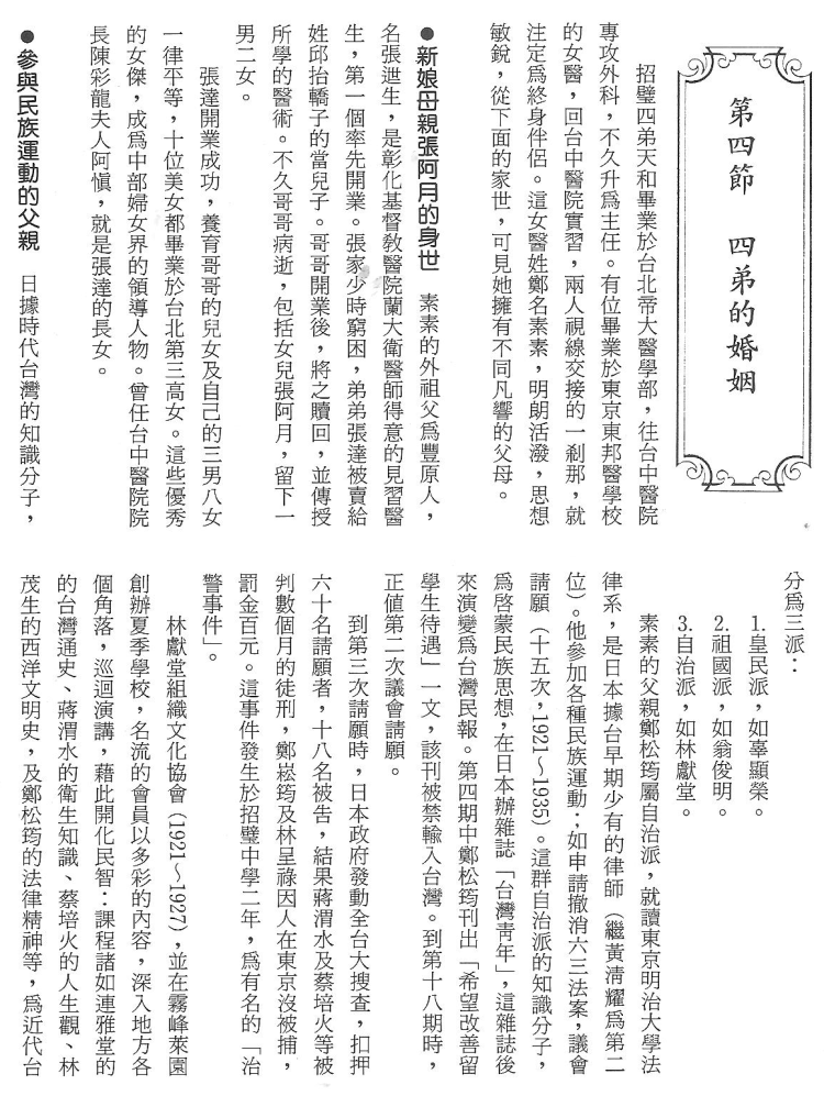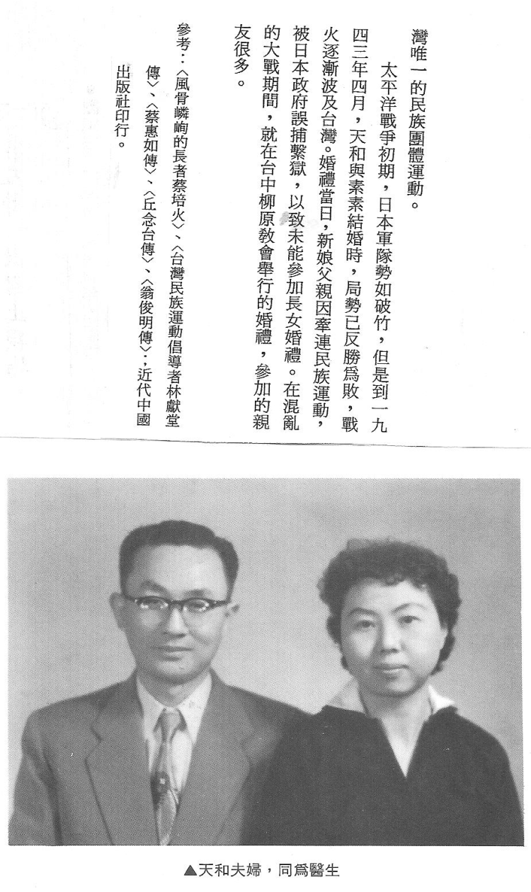 《楊昭璧愛的足跡》楊貞惠撰 曹永洋校訂, 臺中市 楊貞惠 1998年10月 p.74-76 「四弟的婚姻」,有 圖像 楊天和鄭素素夫妻。楊天和醫師(1913-1982),於1943年4月與東京東邦醫學校畢業的女醫鄭素素結婚。鄭素素是鄭松筠律師與張阿月的女。