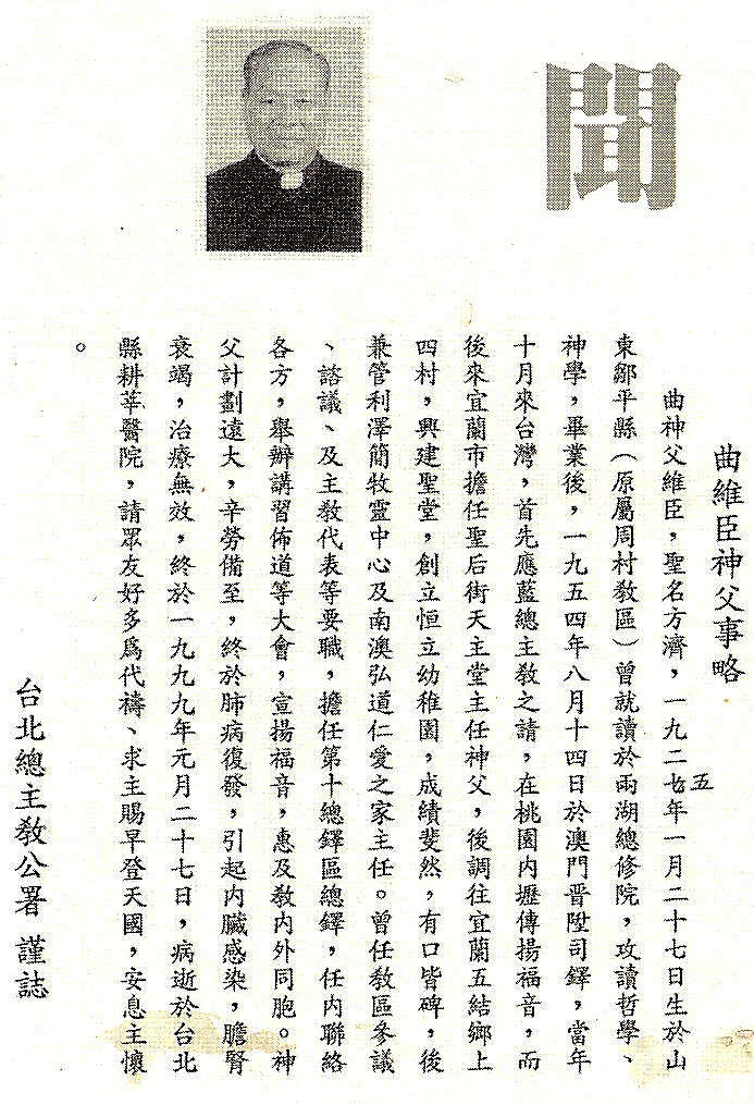 曲維臣神父訃音 《宜蘭縣基督教傳教史》陳梅卿編撰 2000年1月 宜蘭縣政府出版 p.74-75 提及。 曲維臣神父,山東鄒平縣人,1925年1月27日生,10歲時因方濟會在故鄉傳教即入信,後入教會學校(黎明中學)、進兩湖總修院(攻讀哲學、神學),1949年離開大陸,1954年8月14日於澳門晉陞司鐸,當年10月來台,先在桃園內壢,1957年來宜蘭,此後即在宜蘭傳教,五結鄉的教堂皆為曲神父所創,1999年1月27日病沒。