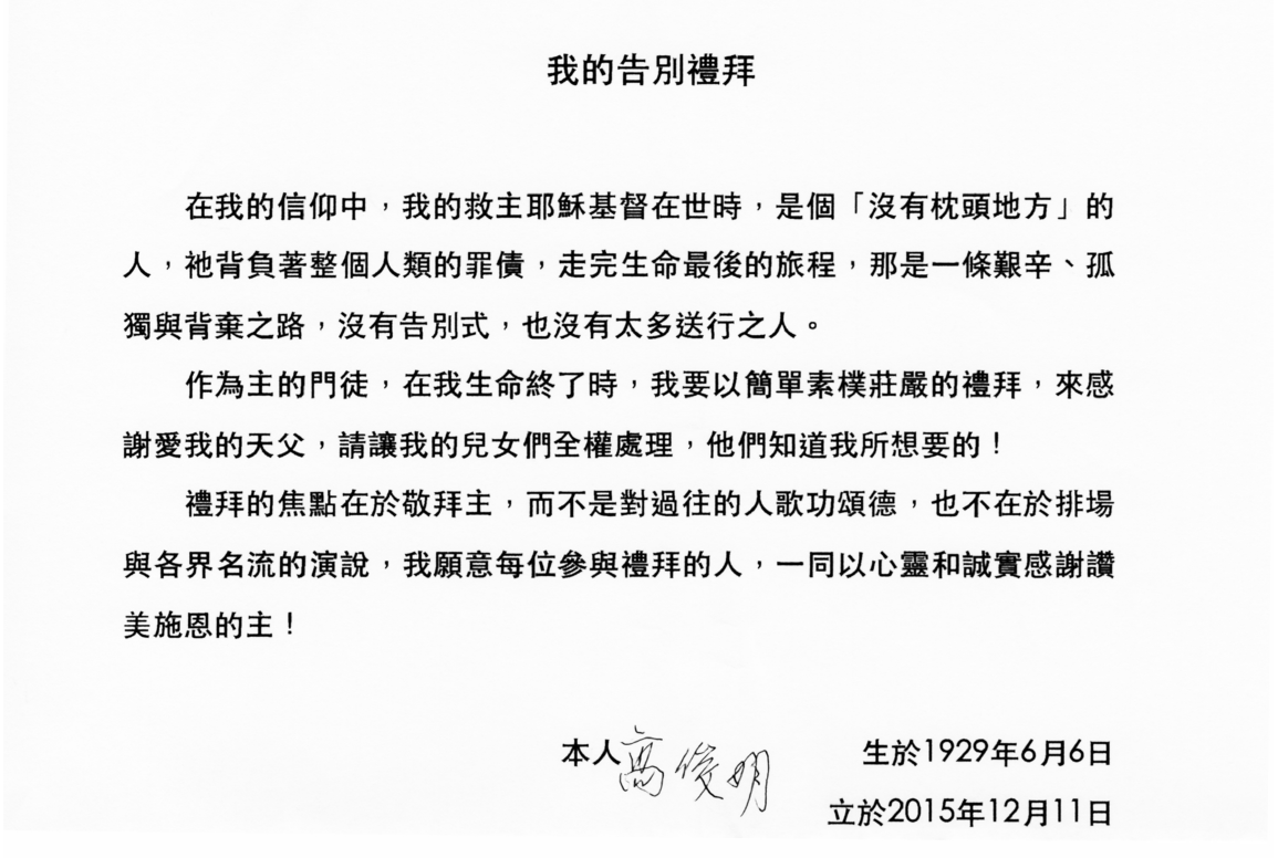 高俊明牧師家屬的訊息。高俊明牧師,1929年4月6日出生,2019年2月14日安息; 高俊明牧師子女 (慕源、黎香、黎理)發聲明,希望各界尊重高牧師對自己的告別禮拜的構想。附高俊明於2015年12月11日寫 的「我的告別禮拜」。2019年年2月14日是爸媽結婚61週年紀念日,中午前,我們在德輝苑的臥室與爸媽一起讀經禱告,感謝神在爸媽生命中奇妙的愛與恩典,讓他們在患難中依然互相扶持,走過許多有主同行的美好路程,下午爸爸在睡夢中安息主懷!我們深深感謝教會各界人士的關心,特別是最後的這段日子,得到新香蘭教會與部落、台東馬偕醫院、郭倍宏長老夫婦、許重勝醫師、新樓醫院、德輝苑,許許多多醫護人員以及同工細心地看顧,讓我們的爸爸深深感動與感謝。爸爸過世的消息傳開之後,許多教會人士都盼望能付出心力來為爸爸安排總會葬、中會葬、教會葬等事宜,但是爸爸在這一兩個禮拜的病危中,重申三四年前多次交代的遺言,請我們能幫他完成他的心願,所以我們需要共同作以下的說明。爸爸交代我們,他過世時不發紙本訃文,僅以line、教會公報、總會網站讓親友知道他已過世,並懇辭總會、中會各界協助籌備之善意,照爸爸心意由我們兄妹三人負責,以簡單、素樸、莊嚴的方式舉行告別禮拜,並懇辭輓聯、花圈、花籃、慰儀。他盼望的告別禮拜,是與參與的親友一起向神獻上感恩,因為禮拜的焦點是神,不是人!爸爸曾提到2016年他生病時,當時的總會議長舒度牧師與總幹事林芳仲牧師來探訪他,爸爸非常明確表達他期待的告別禮拜方式,絕對不可以有總會葬之類的事情發生,他懇請他們能理解並尊重他的意願,議長與總幹事都答應尊重他的決定,決不加以干涉,爸爸也為此深深感謝他們的理解。我們確信,我們的救主耶穌基督已經迎接爸爸榮返天家,我們確信,那裡不再有死亡,也不再有悲哀、哭號、疼痛,因為以前的事都過去了。我們確信,寶座中的羔羊必親自牧養祂的百姓,領他們到生命水的泉源。爸爸以嶄新的生命在永恆的國度裡,有一天,我們也必與他在天國相聚。我們將爸爸於2015年12月11日所寫的〈我的告別禮拜〉附上,謝謝各位的關心、愛與代禱,我們會按照爸爸的心意舉行簡單、素樸、莊嚴的告別禮拜,願三位一體的神親自施恩賜福您們!