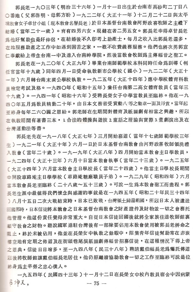 黃大社撰 《台灣基督長老教會台南民族路教會創設八十週年紀念冊》1982年7月 p.75 郭孟揚長老,1903年1月11日生於台南市,父親郭啟明,母親方盼,而於1954年11月12日去世。他於1922年12月22日與卓甘(卓道生傳道次女)結婚,夫婦育4男6女。夫婦均任台南民族路教會長老。