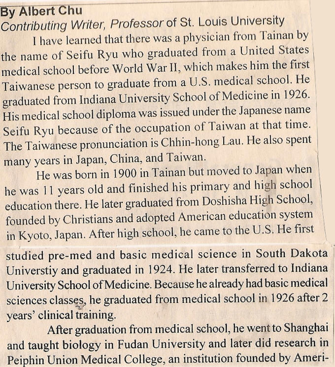 By Albert Chu (朱真一)《太平洋時報》 PacificTimes 2003年9月11日 (Sept. 11, 2003)p.11 Lau Chheng-hong (劉清風 1900-1978)of Tainan(台南) ,under the Japanese name Seifu Ryu, was awarded medical school diploma from Indiana University School of Medicine in 1926.