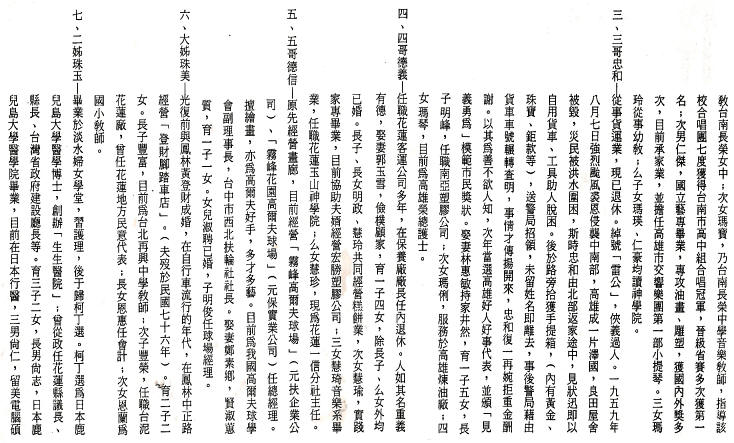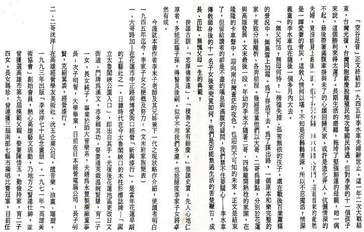摘自 陳玉珍「入園細數纍纍繁華枝--《空谷足音》跋」見於 李末子撰 《空谷足音--我的父親李水車》1994年 p.218-223。 按:傳道師李水車(1893.5.27 –1945.9.7).柯月霞夫婦育有五男六女;長男 李路加,、次男 李洸洋、三男 李忠和、四男 李德義、五男 李德信、長女 李珠美(適黃登財)、二女 李珠玉(適柯丁選)、三女 李妙好(適郭子究)、四女 李妙婉(適胡歷史)、五女 李淑慎(適林安武)、六女 李末子(適柯呈聯)。
