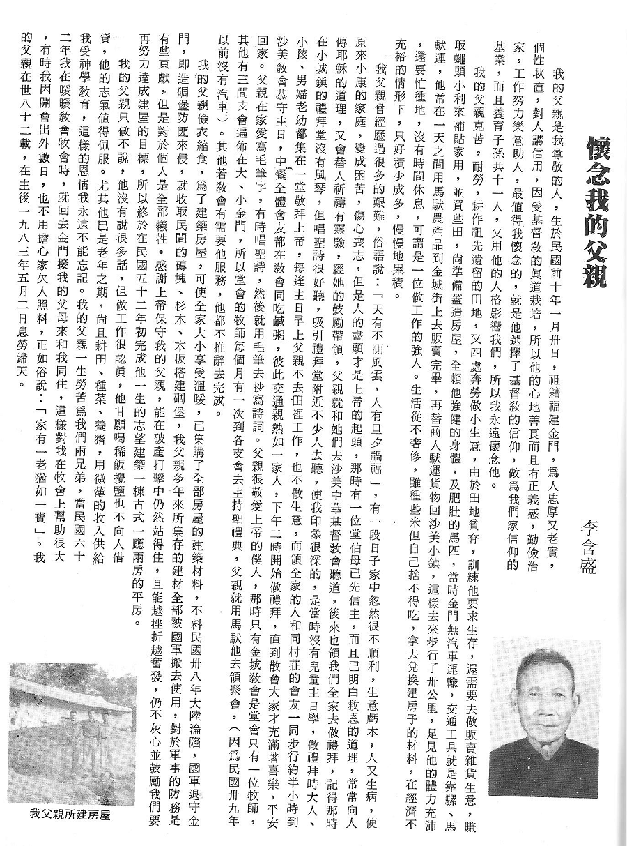 李含盛撰 《台灣基督長老教會四結教會慶祝設教 廿 週年記念特冊》 1983年11月12日 P. 57。李含盛牧師的父親李有興,民國前10年(1902年)1月30日生於福建金門,1983年5月2日去世,享年82歲。有 圖像 李有興。