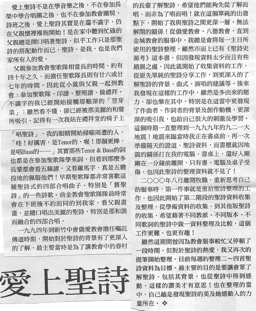 李仁豪撰 「 愛上聖詩」《台灣教會公報》 2762/2763 期 2005年1月31日—2月13日 p. 19。