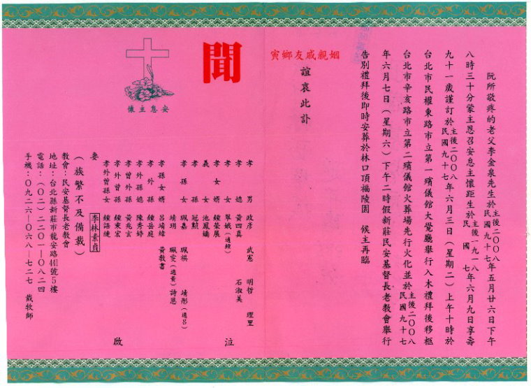 李金泉先生,1918年6月9日生,於2008年5月26日去世,享壽91歲。2008年6月7日假新莊民安基督長老教會舉行告別禮拜。
