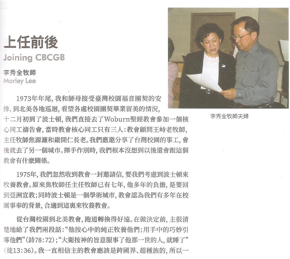 李秀全撰 「上任前後 Joining CECGB」 見於 《這五十年 波士頓郊區華人聖經教會五十週年特刊 》2019年10月 p.95-96。 李秀全(Rev. Morley Lee) 1977年3月任波士頓郊區華人聖經教會( CECGB ) 主任牧師 共18年 ,1994年底由教會差派投入普世宣教,任中華海外宣道協會總幹事及工廠主任。2001年創立國際關懷協會,現為該會名譽會長。師母林靜芝。
