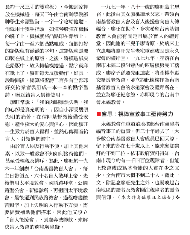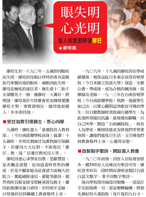 眼失明心光明 盲人教會創辦者廖旺