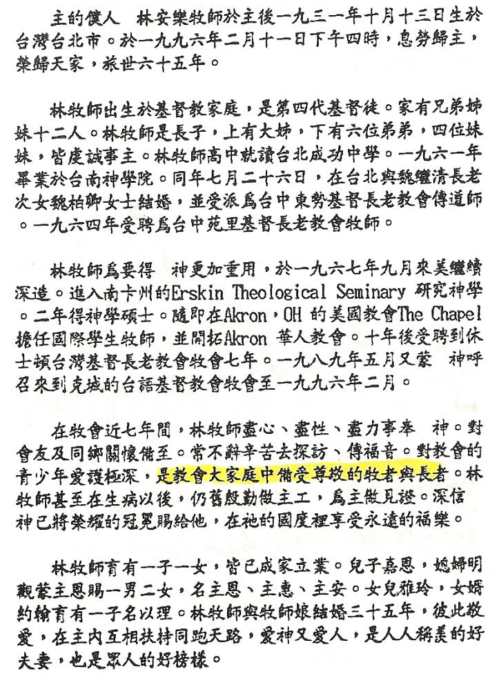 《林安樂牧師紀念集》1997年 p.1按:林安樂牧師,1931年10月13日生,1996年2月11日去世,享年65歲。 祖父林溫良娶余傳臚長老之女為妻,生林正元(1894-1960)。林正元娶周賞賜(周木之女),育七男五女,而林安樂是其長男。林安樂娶魏柏卿(魏繼清長老次女)為妻,育1男1女,即林嘉恩(John)及林雅玲(G