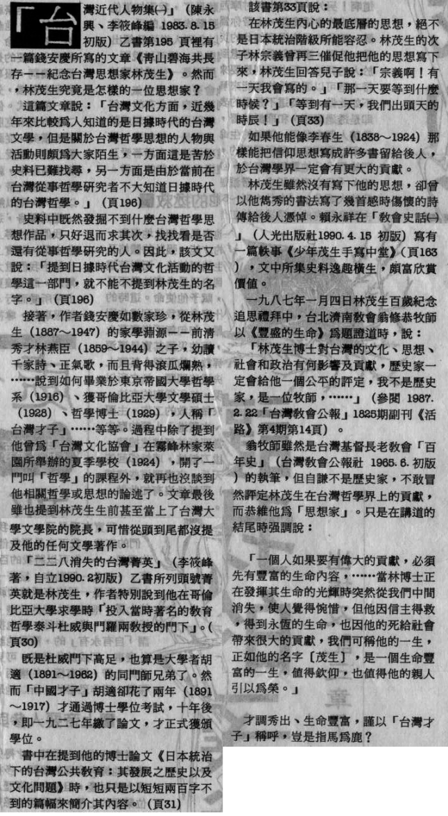 “林茂生,才調秀出、生命豐富,謹以「台灣才子」稱呼,豈是指馬為鹿?”