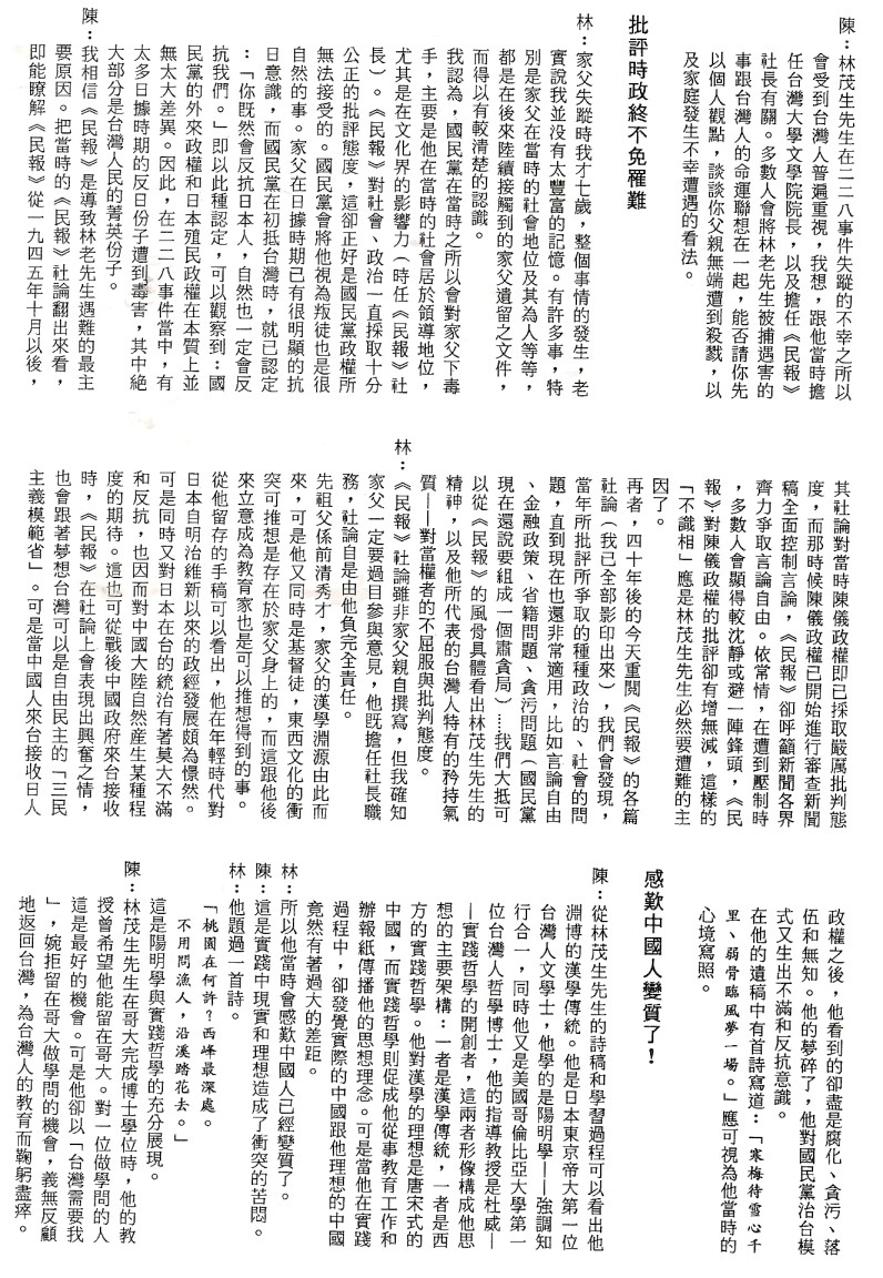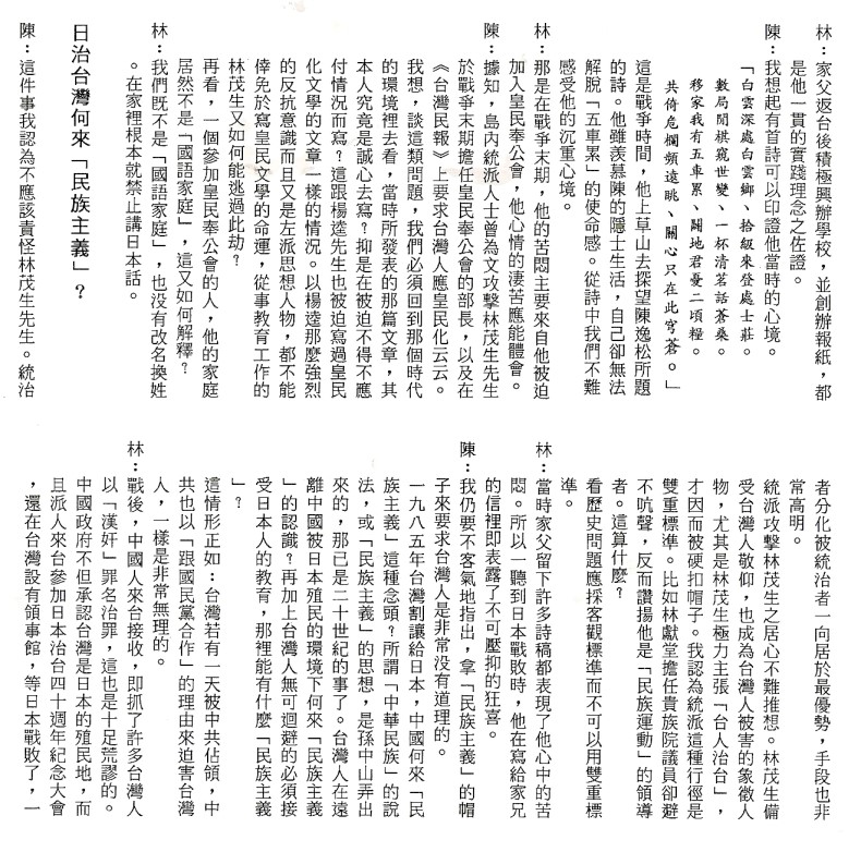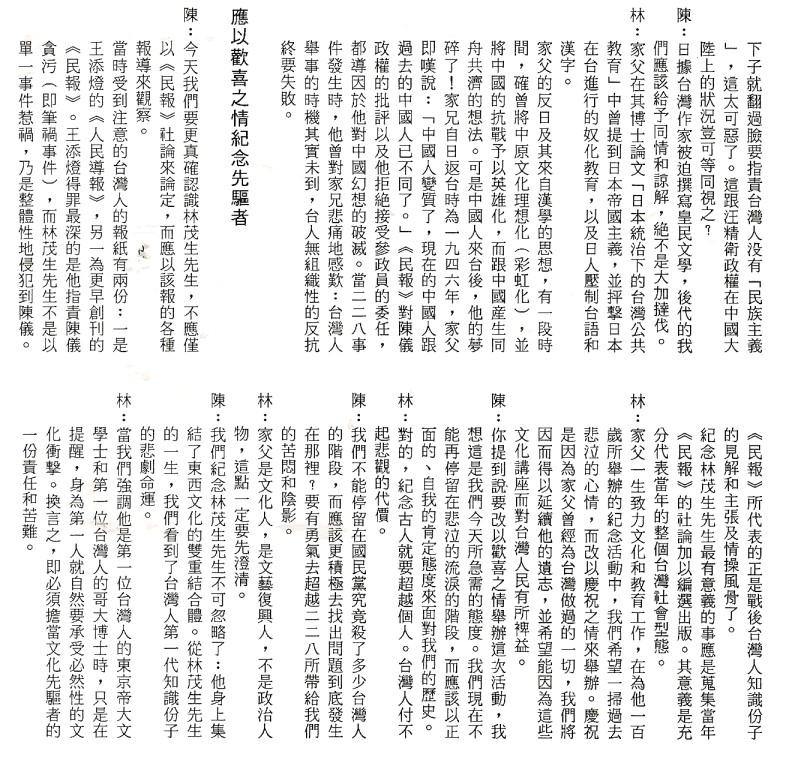 林宗光、陳芳明對談 郭秋霖整理 原載《南方雜誌》1987年11月號; 轉載於台南長榮高級中學編印 《林茂生博士紀念專輯》1991年7月 p.29-32。 時間:1987年8月30日 地點:美國加州聖荷西市(San Jose)