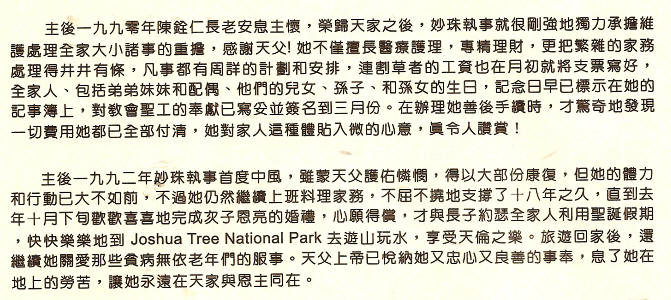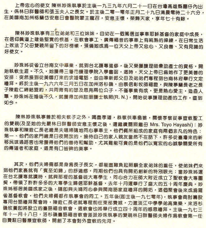 錄自 陳林妙珠執事追思禮拜手冊。 按:洛杉磯台福基督教會陳林妙珠執事(Marian Miaw-ju Chen),1939年6月21日生於高雄縣圍仔內,是林日詳醫師和張玉夫人的長女,一家屬台南聖教會。1966年3月5日她和陳銓仁藥師(長老, 陳夢蘭長老長男)結婚,1970年10月11日台福基督教會成立感恩禮拜就是在夫婦府上舉行的。夫婦育有2男,即約瑟(Joseph)及恩亮(Samuel)。她婚後不久就獲得加州註冊護士執照(R.N.) 一直從事護理助產工作。夫婿於1973年3月27日去世,而她於2010年1月29日去世,享年70有餘。詩篇121是她最愛。