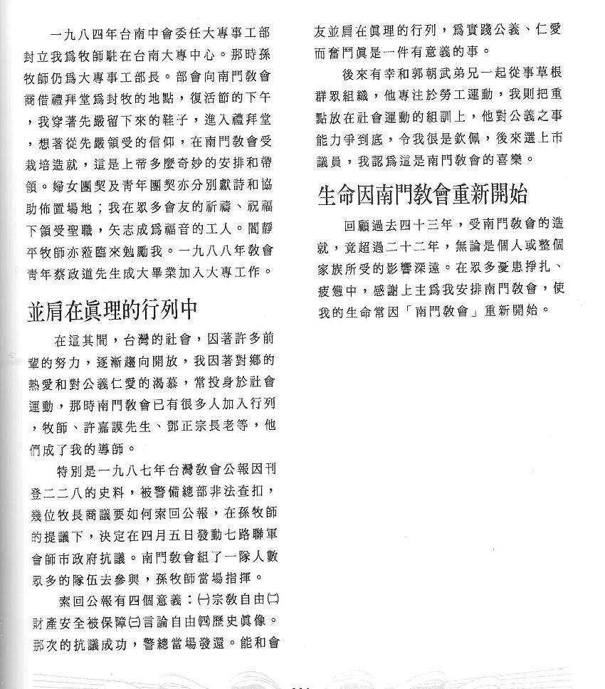 林宗正撰 《台灣 基督長老教會南門教會設教六十週年紀念》 1993年1月3日發刊 p.114-116。 林宗正牧師,1950年3 月4 日出生於台南市,是寶文齋書局主人林占鰲長老的長男。1979年台南神學院研究所畢業。文從他搬家參加南門教會談起。分段: 想擔任主日學教員 - 從野外主日學到福華佈道所 - 南門教會女宣的媽媽們在禱告著 - 我的母親我的弟兄 - 並肩在真理的行列中 - 生命因南門教會重新開始。