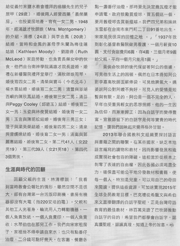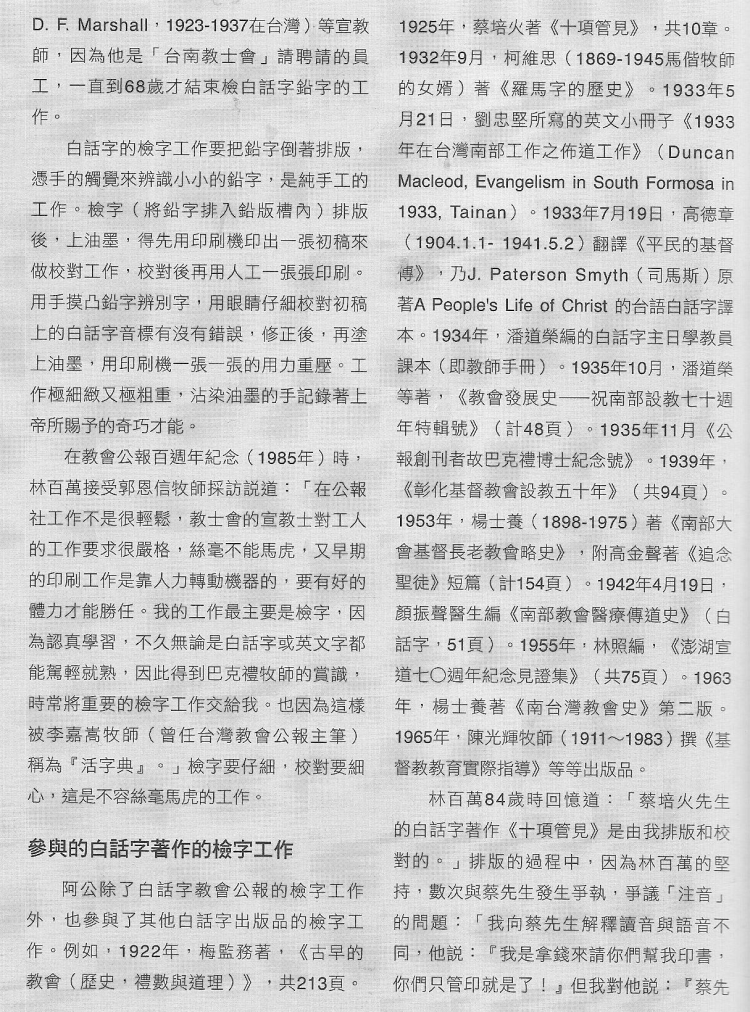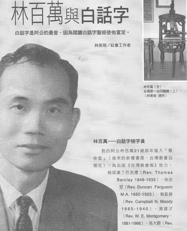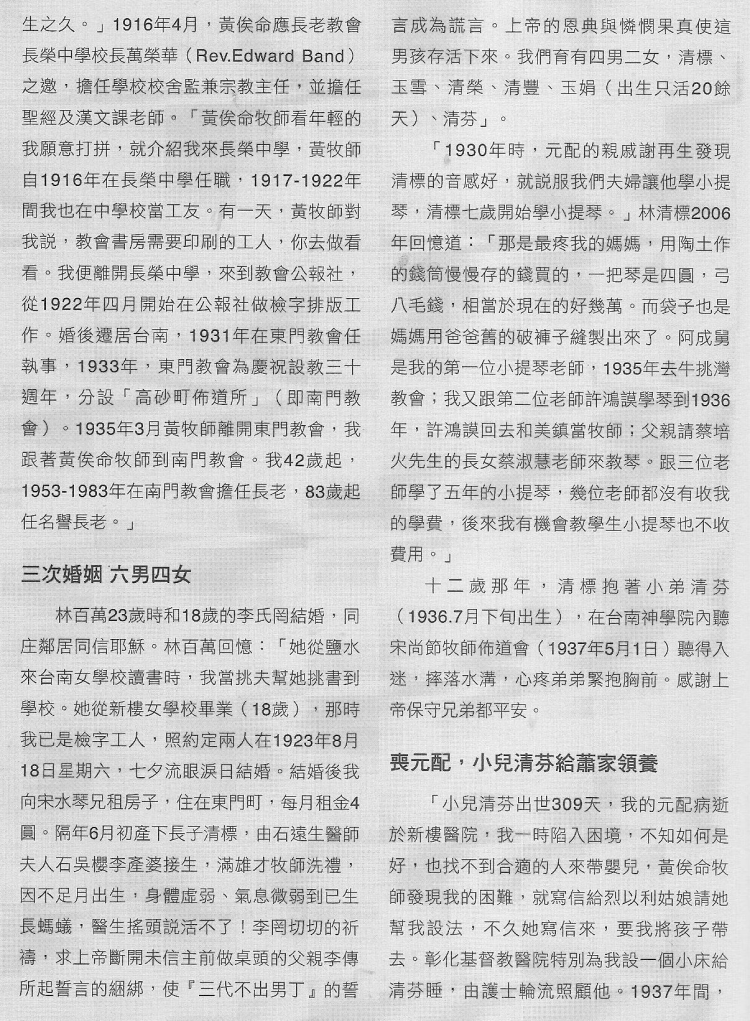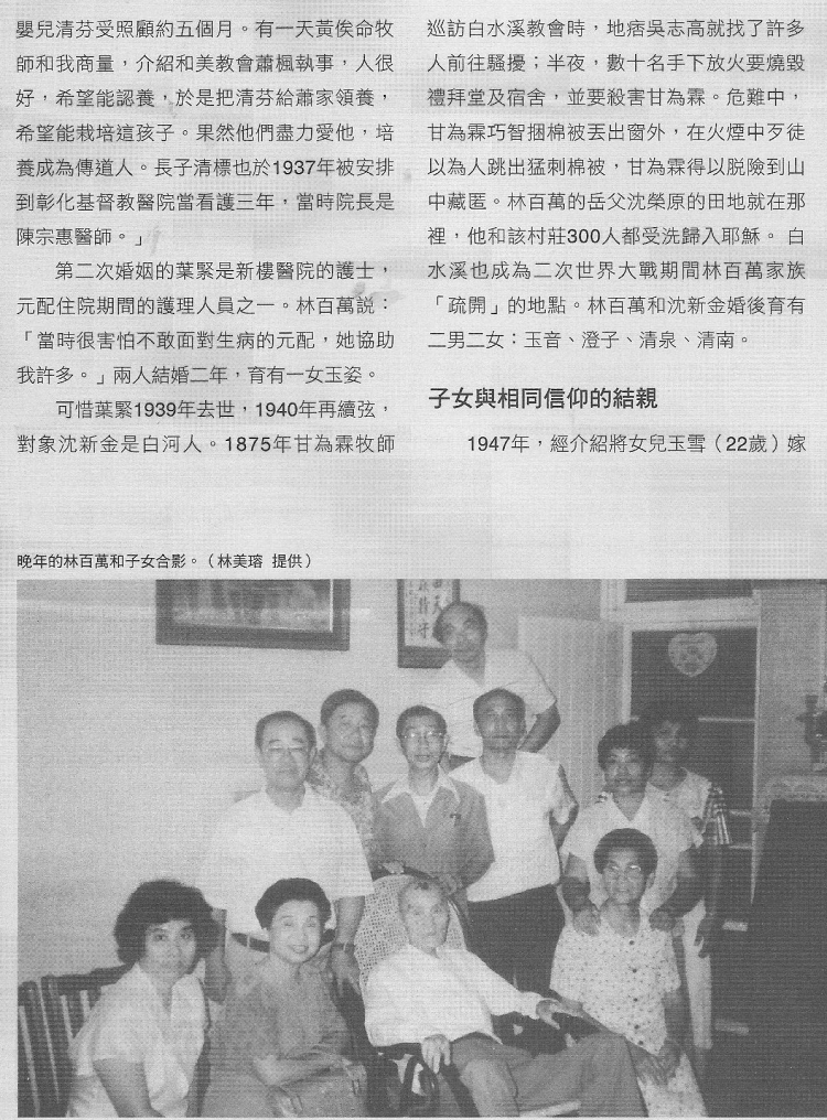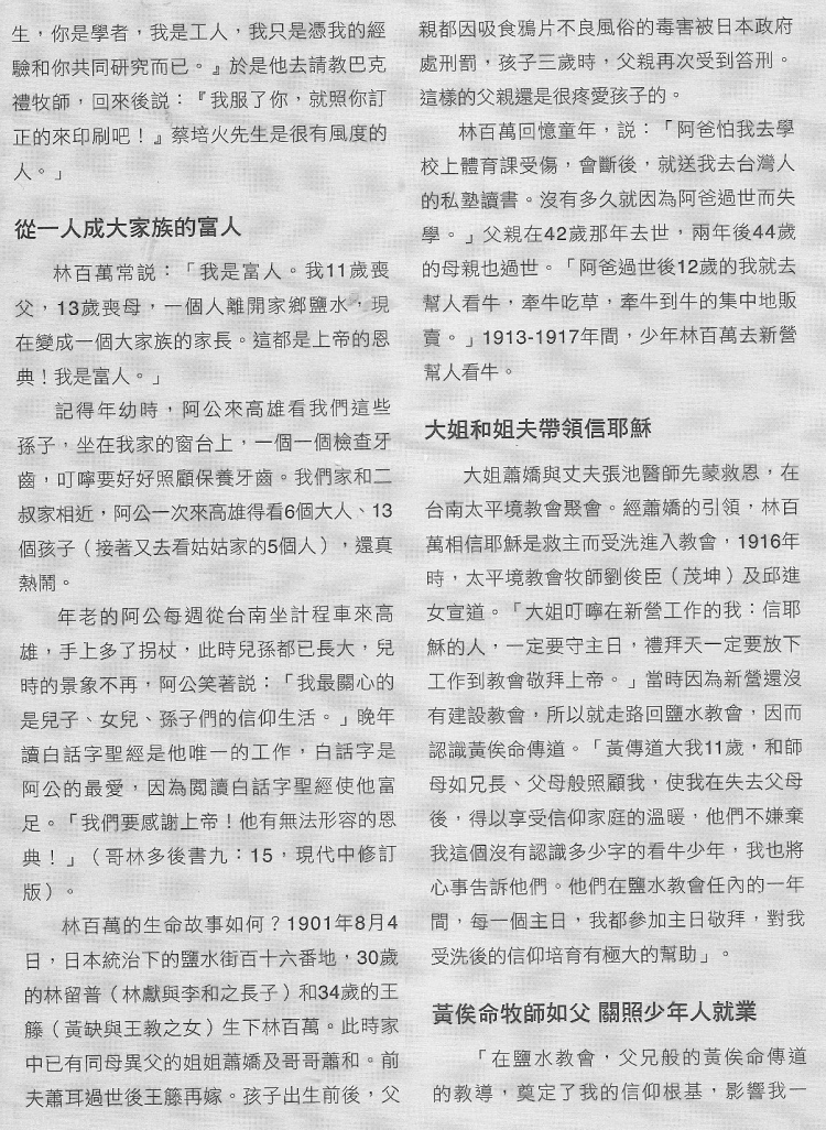 林美蓉撰 《新使者雜誌》138期 2013年10月10 日 p.63-68 台灣教會人物檔案。 文分段: 林百萬 白話字檢字員、 參與白話字著作的檢字工作。 從一人成大家族的富人、 大姊蕭嬌和姊夫張池醫師帶領信耶穌、 黃俟命牧師如父關照少年人就業、 三次婚姻六男四女、 喪元配,小兒清芬給蕭家領養、 子女與相同信仰的結親、 生涯與時代的回顧。