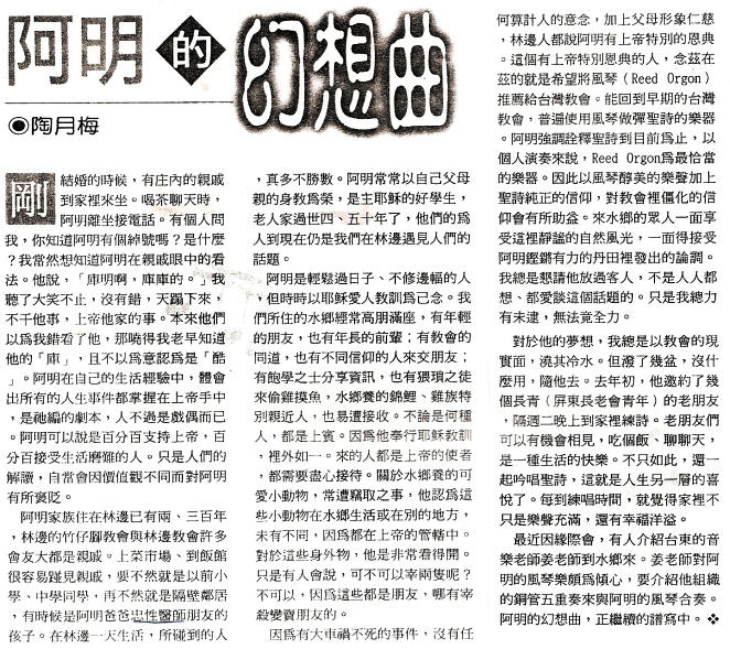 陶月梅撰 《台灣教會公報》 2448期 1999年 1月21 日 p.20。