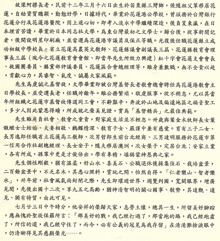 治喪委員會撰。 梁阿標長老,1900年3月16日生於苗栗縣三灣鄉,7歲時隨祖父梁阿亮(參見梁阿亮長老小傳)全家移居花蓮。 父親梁阿海(參見花蓮港梁阿海長老)。妻葉儆醒是葉金木牧師長女(參見《教會史話》580 葉金木是陳熊女婿)。 育3男2女:梁逸郎、梁哲郎、梁達明、梁安子、梁榮子。梁阿標於1994年7月23日去世