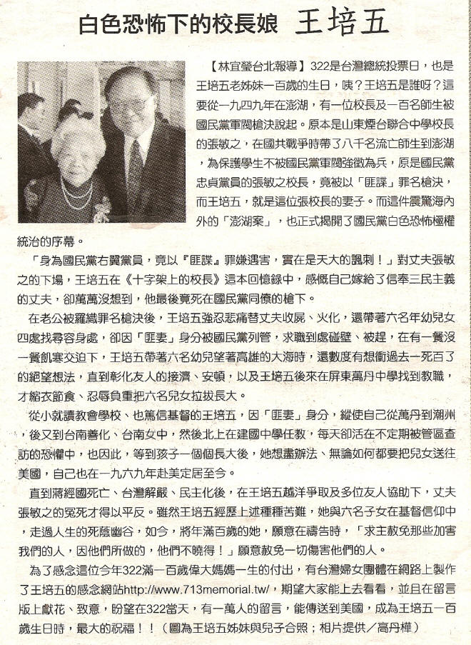 王培五是1949年澎湖713事件受難張敏之校長的遺孀,而2008年3月22日是她一百歲的生日。