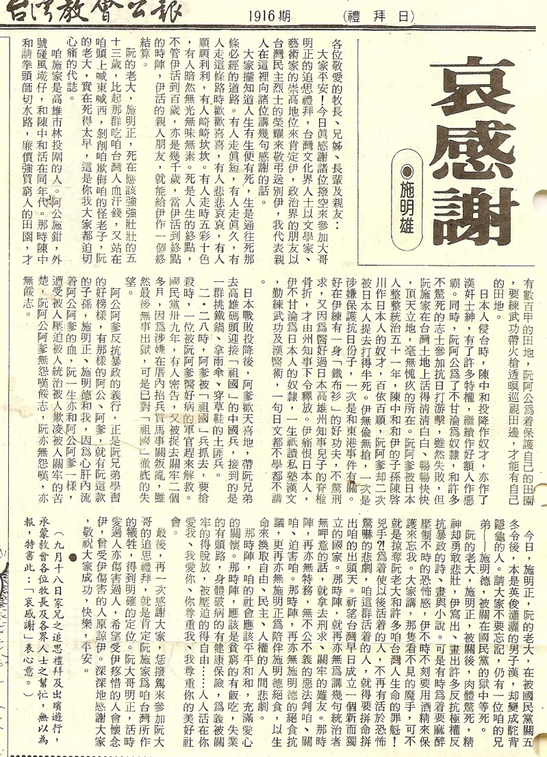 施明雄撰 《台灣教會公報》1916期 1988年11月20日 P.11。