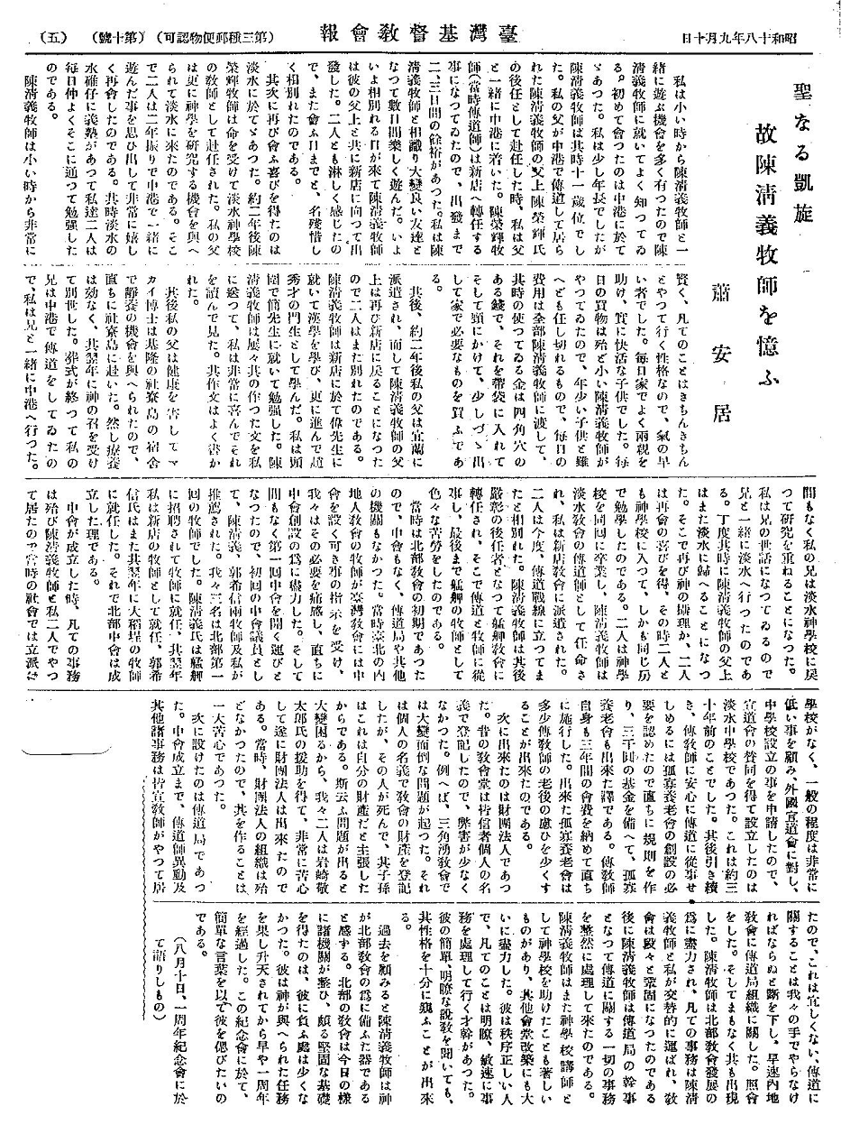 蕭安居述 《台灣基督教會報》10 號 昭和18年9月10日 p.5 日文。 陳清義(1877..4.3-1942.8.11)は陳榮輝 (1851- 1898,牧師)の長男 。蕭安居(1874.1.14-1964.7.18)は蕭大醇(1821-1892)の四男。