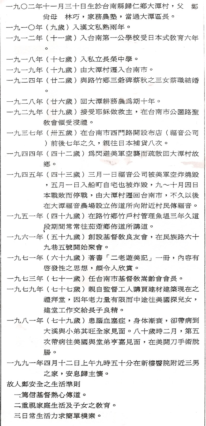 鄭安全先生,1902年11月30日生於歸仁鄉大潭村,父鄭尚、母林巧。