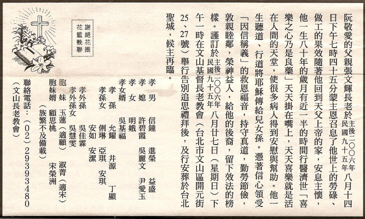 文山教會張文輝長老,於2006年8月14日去世,一生80年的歲月有近一半的時間行醫濟世。