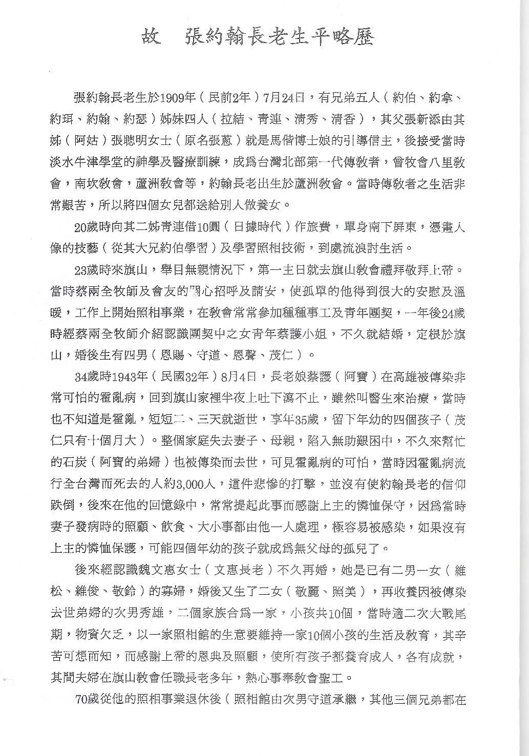 ¿ý¦Û¦w®§§i§O§«ôµ{§Ç¡C ±i¬ù¿«ªø¦Ñ¡A1909-¦~7¤ë24¤é¥Í¡A ¬O ±i·s²K¡]°ºèû²zªª®v®Q±iÁo©ú¤§§Ì, ¶Ç¹D®v¡^¤§¤T¨k¡C24·³»P½²Å@µ²±B¡A¨| 4¨k ¡]®¦½ç¡B¦u¹D¡B®¦Án¡BZ¤¯¡^¡C34·³®É ½²Å@¯f¤`¡C «á»PÃQ¤å´f¦A±B¡C¤å´f¬O¹è°ü,¡A¦³2¨k1¤k¡]ºûªQ¡Bºû«T¡B·q¹a¡^¡A±B«á¥Í2¤k¡]·qÄR¡B·Ó¬ü¡^¡A¦A¦¬¾i¥h¥@§Ì°ü¤§¦¸¨k¨q¶¯¡A¥þ®a¤p«Ä¦@¤QÓ¡F¨ä¶¡¤Ò°ü¦bºX¤s±Ð·|¥ôªø¦Ñ¦h¦~¡C70·³±q·Ó¬Û¨Æ·~°h¥ð¡A´N§ë¤J©ó·Ë¬w«Å±Ð¨Æ¤u¡A²×©ó1982¦~4¤ë¤j¬w±Ð·|Äm°ó¡C1994¦~12¤ë6¤é¨®º×,¯f±¡ÄY«¡C1995¦~10¤ë14¤é¥h¥@¡A¡e10¤ë21¤é¦b¤j¬w±Ð·|Á|¦æ ¦w®§§i§O§«ô¡^¡C