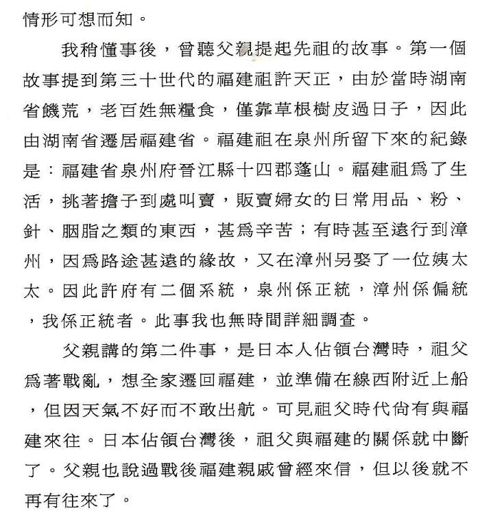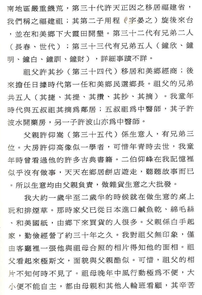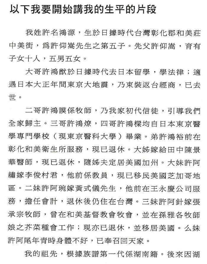 許鴻源撰 《許鴻源博士口述自傳》 許氏基金會 (盧俊義編) 1994年7月 p.23-25。適自「我的童年」。 許鴻源(1917-1991)是和美生意人許仰嵩之五男,族譜上是第36代。第34代許其抄移居和美經商,為日治時期第一任和美庄長。第35代許仰嵩為雜貨生意的大批發,經營排煙草、美國紙、從日本進口鹹魚乾、醞仔魚、棉毛絲等,育5男5女,長男許鴻猷經商,次男許鴻謨牧師,三男許鴻燎及四男許鴻樑均是醫生,五男許鴻源為日本藥學博士,長女許阿淑適田中陳景華,次女許阿鏽適李俊村,三女許阿婉適台塑公司黃式儀,四女許阿針適張承宗牧師,五女許阿尾年青時身體不好,已經去世。(六男許鴻裕)。