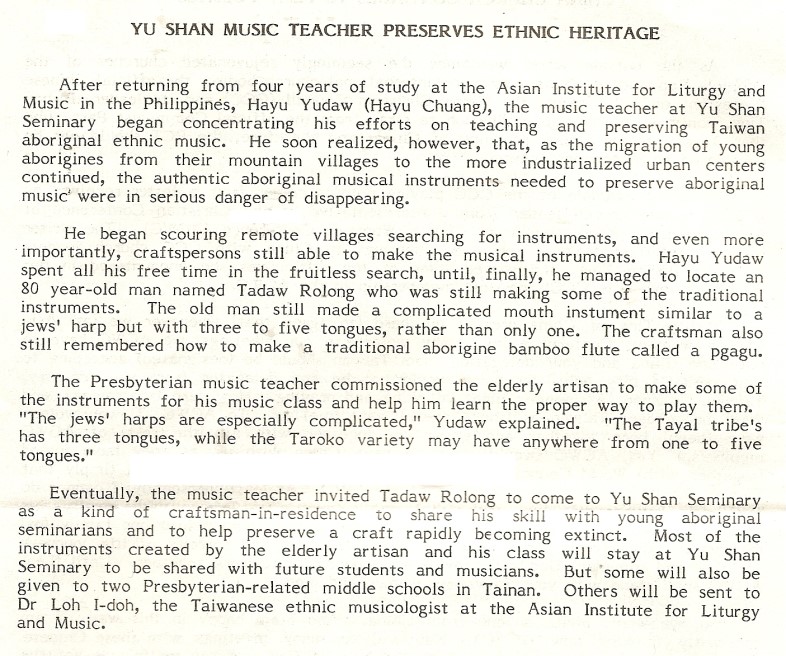 YU-SHAN MUSIC TEACHER PRESERVES ETHNIC HERITAGE
