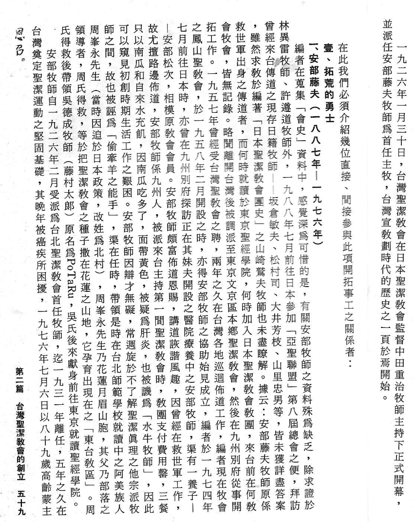 《基督教台灣聖教會會史》陳主培主編,1989年 p.58-60。1926年1月30日,台灣聖潔教會在日本聖潔教會監督中田重治牧師主持下正式開幕,並派任安部藤夫(1887-1976)牧師為台北聖潔教會首任主牧(1931年離任),安部於1976年7月6日去世,享年89歲。