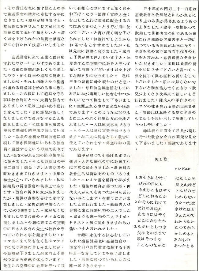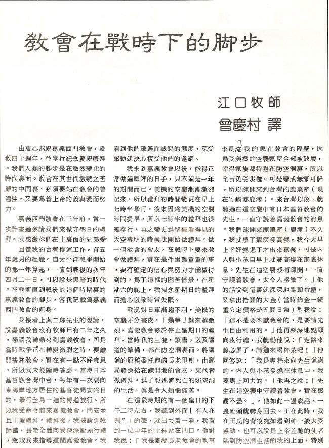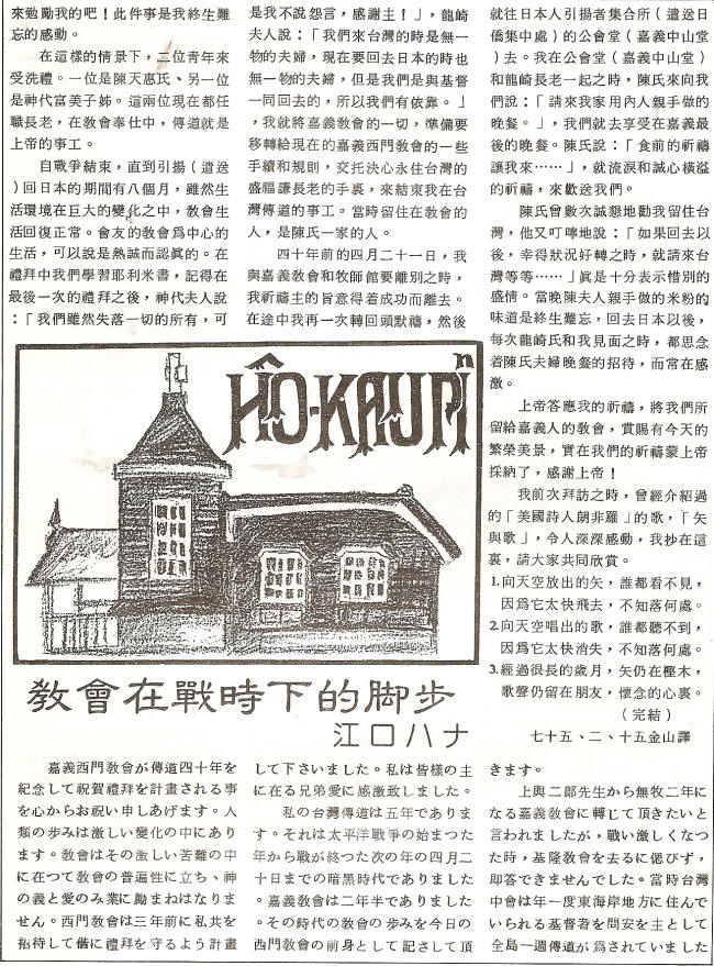 江口ハナ講 《台灣基督長老教會嘉義西門教會設教四十週年紀念特刊》1986年 p.2-4 錄 曾慶村中譯文及日文(原文)。 按:江口ハナ牧師,原姓釜土,1907年2月生於富山縣新川郡,橫濱共立女子神學校畢業,1941年按牧,牧日本基督教會基隆及嘉義教會,戰後返國與江口忠八牧師結婚, 與夫共同牧所開拓的立川教會,夫去世繼續牧會直至 1979年8月26日去世。夫婿江口忠八牧師,1904年2月21日生於青森縣八戶町,新公同神學校畢業,1933年11月受按牧,牧日本基督教會高雄教會13年。戰後返國在御殿場教會牧會(1947-1950)3年後,在立川開拓傳道設立教會,任其首任主任牧師。