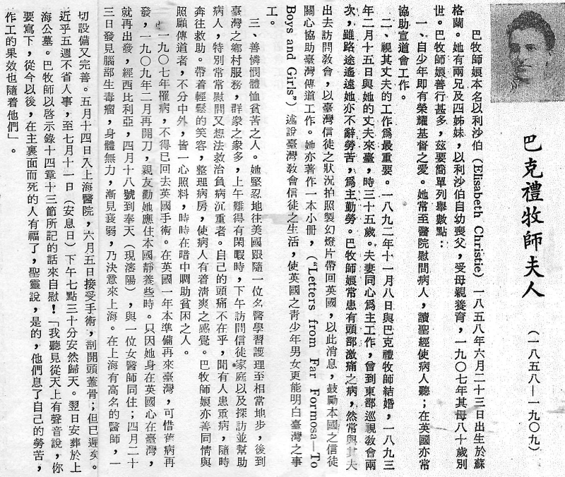 楊士養編 《台���信仰名人略傳》1 集 p.81-83, 楊士養編 林信堅修訂 《信仰偉人列傳》1989年 p.83-84 巴克禮牧師娘,本名以利沙伯(Elisabeth Christie),1858年6月23日生於蘇格蘭,1892年11月8日與巴克禮牧師結婚,1909年7月11日在上海去世。