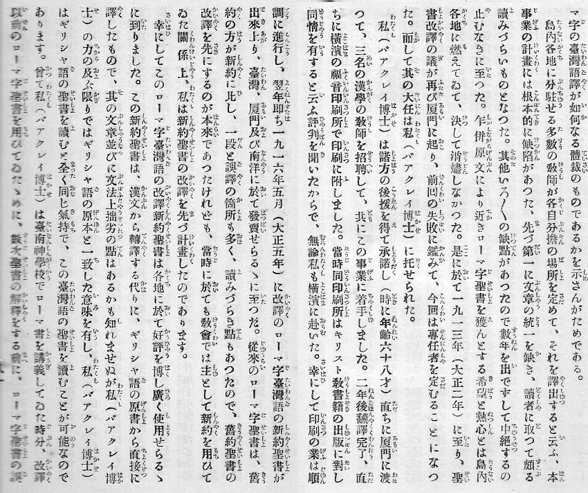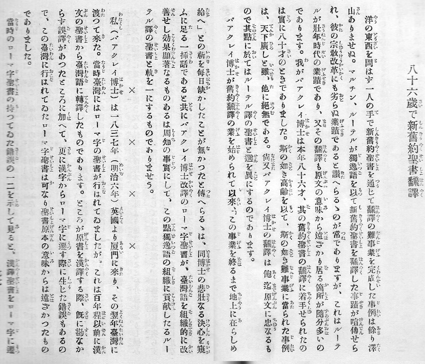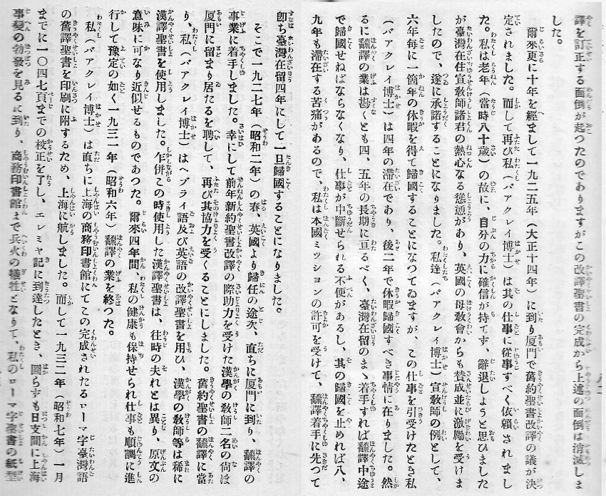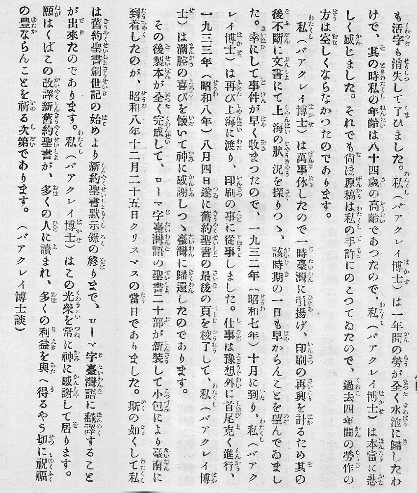 Barclay,Thomas,1849-1935 井川直衛著 《バアクレイの面影》台南 基督教真理社 1936年 p.76-85 日文 。....1932年1月商務印書館兵火の犧牲となり羅馬字聖書の紙型字活字も消失(1047頁まで校正した)。.1933年8月4日遂に舊約聖書最後の頁を校了、 12月25日當日 聖書20部小包により台南に到着した。