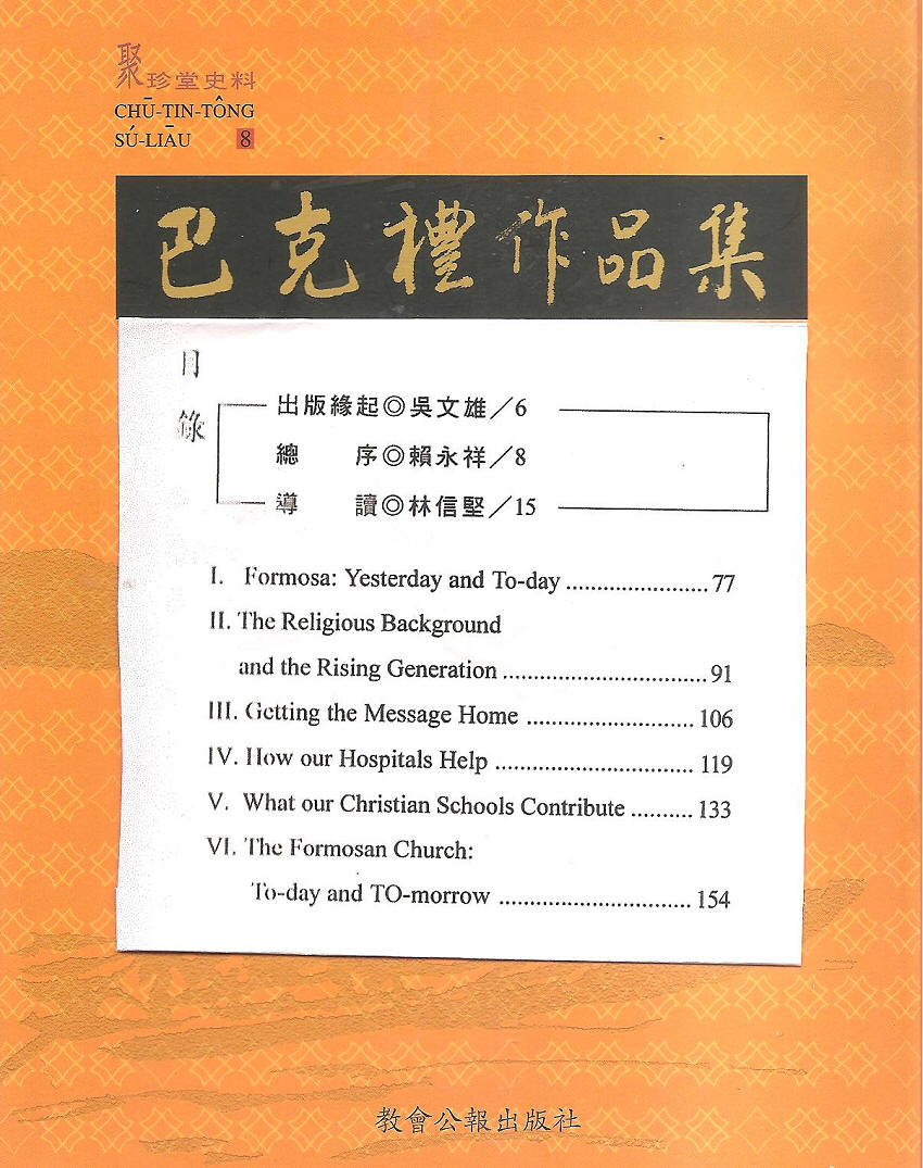 Barclay,Thomas (巴克禮)撰 《巴克禮作品集》台灣基督長老教會歷史委員會策畫 台灣教會公報社出版 2005年5月 209頁 聚珍堂史料。林信堅導讀。