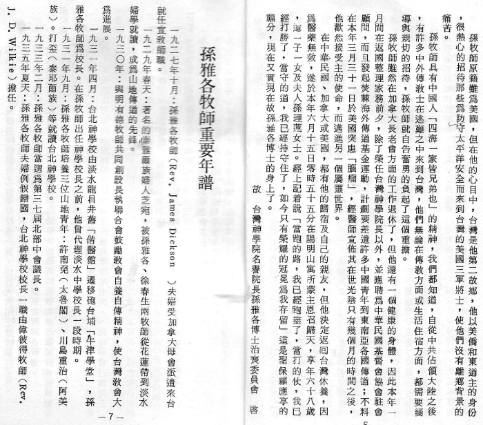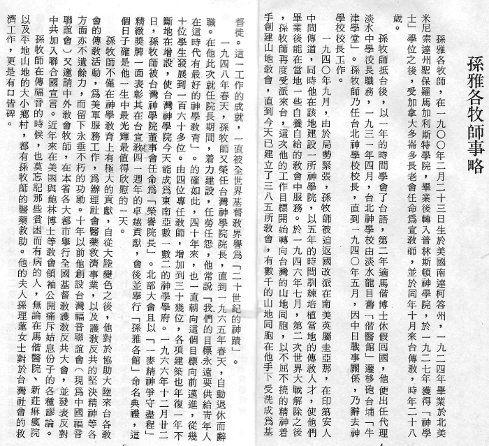 《孫雅各牧師紀念專集》 1977年 p.4-9。