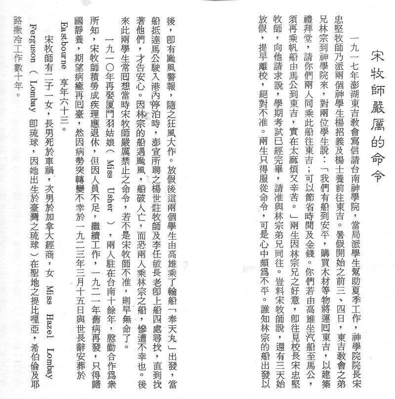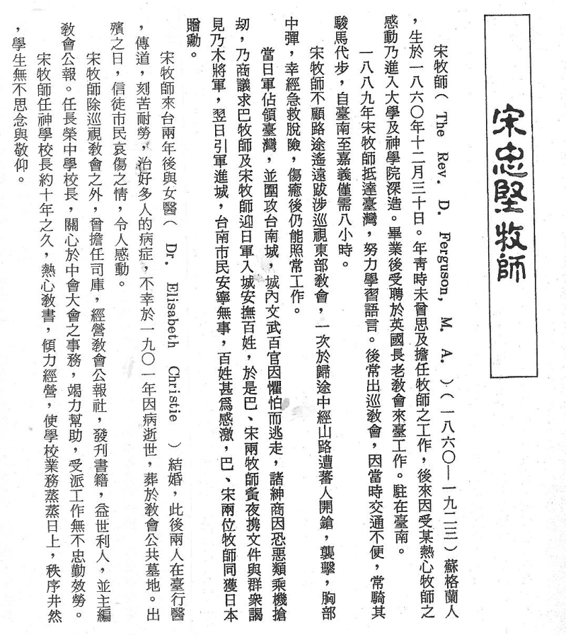 |  | 楊士養編 《台灣信仰名人略傳》1 集 p. 103-106;楊士養編 林信堅修訂 《信仰偉人列傳》1989年 p.101-103宋忠堅牧師(Duncan Ferguson, 1860 - 1923):英國長老教會宣教師,1889 - 1923年在台。1895年滿清將台灣割讓給日本,當日軍包圍台南時,宋忠堅牧師與巴克禮牧師持市民聯名請願書往見乃木希典將軍,使日軍順利進城,免除一場浩劫。