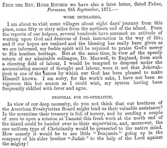 From Rev. Hugh Ritchie,Takao,6th Sept. 1871 |
