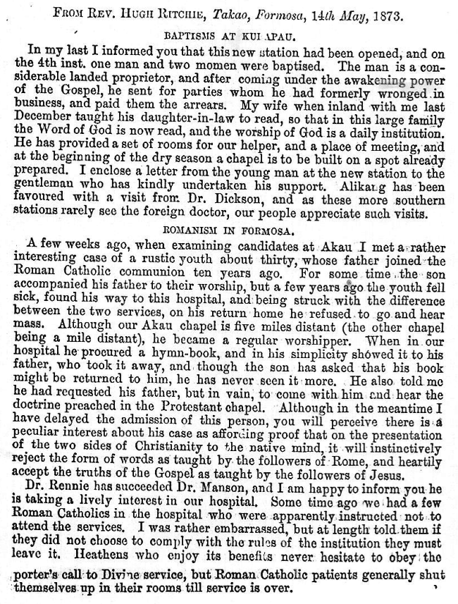 The Messenger and Missionary Record [Sept.1st] 1873 p 238-239 Baptisms at Kui Apau (加納埔 , May 1st,1 man & 2 women baptised) - Romanism in Formosa (Catholic patients not attend the services)