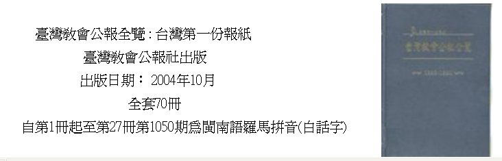 《台灣教會公報》的第一個前身是由台南教士會於1885年創刊的《台灣府城教會報》。該刊是台灣最古早的報刊,1892年易名為《台南府城教會報》,1905年再 易名為《台南教會報》,1928年與北部中會的《芥菜子報》合刊,名改《台灣教會報》,1932年又與高雄中會的《教會新報》台中中會的《福音報》合刊,乃易名為沿用迄今的《台灣教會公報》,其間歷經清朝、日據、戰後的各時代。 《台灣教會公報》所用的語言,早年是以台語為主,用教會白話字表達,到1969年3月以後,才改為中文。這對現代讀者而言,或有「文字「障」的感覺 ,但對研究台語文的人而言,確實是寶庫。 《台灣教會公報》不只傳揚聖經的信息,報道教會的宣教 、醫療,、教育等事工及内外最新消息,也對社會所發生的事件以基督教信仰教會的的立場,有所詮釋。 2005年則是教會公報創刊一百二十週年,《台灣教會公報》社決定發行《《台灣教會公報》全覽(1885~2002)》,其出版將提供豊富的史料,有利於台灣史及台灣教會歷史的解讀,我樂意推薦之。